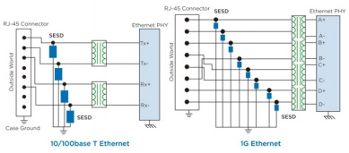 对于机顶盒设备上的 RJ45 端口,同样考虑到因为频繁插拔时由于静电而导致的设备损害,在端口也可以增加上 SESD 器件来保护静电干扰。图4分别展示了在 10/100baseT 及 1G Ethernet 上使用 SESD 器件进行保护的应用。