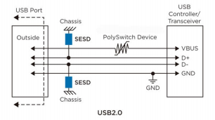 首先是 USB 的接口,无论是 USB2.0 还是目前逐渐普及的 USB3.0,USB 接口是我们最常见并且使用最广泛的数据接口。在便捷的使用过程中,我们也会经常遇到一些故障状态,其中比较常见的就是由于 USB 从设备短路故障而导致的 USB 主设备的损伤,使用 PolySwitch PPTC(正温度系数热敏电阻)器件是一个高性价比的防护方案,在短路故障状态下,PPTC 器件能够快速的动作从低阻态转为高阻态,从而限制电流保护 USB 的设备。另一种 USB 常见的故障是由静电噪音带来的,在热插拔的过程中,静电的影响非常的明显,为减少静电给电路带来的影响,我们可以使用 SESD (硅基 ESD 保护器件),SESD 器件电容低、钳位电压低、ESD 抵抗能量高、封装尺寸小,是 USB 接口静电防护的理想选择。下图 1 是在 USB 端口上使用 PPTC器件与 SESD 器件保护的典型应用。