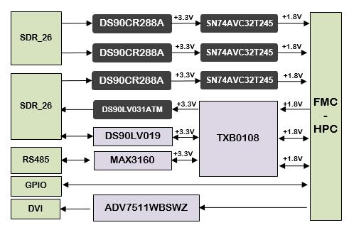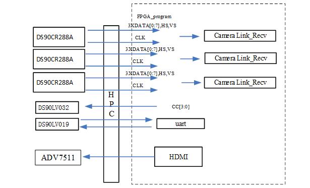板卡提供对应FPGA载板的Camera link信号输入接口程序,包括Camera link 、uart、CC信号。
