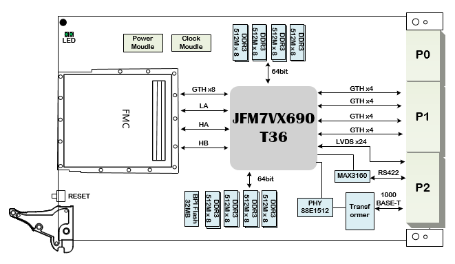 本板卡系我司自主研发的基于3U VPX导冷架构的信号处理板,适用于高速图像处理等。芯片采用工业级设计。该处理板包含1片 FPGA-JFM7VX690T36。板载两组64位宽DDR3,每组容量4GB,一个HPC FMC接口。VPX接口连接4组x4 GTH,24组LVDS,一路RS422,一路1000Base-T。板卡的电气与机械设计依据VPX标准(VITA 46.0),支持导冷,能够满足用户在特殊环境下的使用需求。