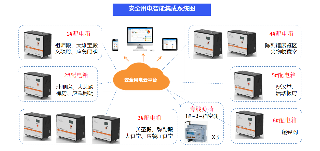 该工程为该寺庙配电改造项目,涉及祖师殿、大雄宝殿、文殊殿、北厢房、大悲殿禅房、关圣殿、弥勒殿大食堂、素餐厅食堂、陈列馆展览区、文物收藏室、罗汉堂、活动板房、藏经阁共十多个区域。根据对应配电箱后负载统计及项目需求,设置了9台智能安全配电装置,分别对应如下:1#配电箱对应的祖师殿、大雄宝殿、文殊殿配置一台36kVA 的智能安全配电装置,2#配电箱对应的北厢房、大悲殿禅房配置一台20kVA 的智能安全配电装置,3#配电箱对应关圣殿、弥勒殿大食堂、素餐厅食堂区域后续负载较多共配置3台智能安全配电装置,包括1台30kVA 的和2台20kVA 的,4#配电箱对应的陈列馆展览区和文物收藏室各配置1台20kVA 的智能安全配电装置,5#配电箱对应的罗汉堂和活动板房配置1台30kVA 智能安全配电装置,6#配电箱对应的藏经阁配置1台20kVA的智能安全配电装置 。为了方便装置的监测和管理,提高管理效率,本方案还配置了安全智慧用电系统,通过无线通讯的方式接入安全用电管理云平台,方便管理人员对所有安装了智能安全配电装置的场所进行维护,项目具体配置见以下示图。