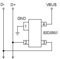 ESDSR05 器件1脚接GND ,4脚接USB电源VBUS 2脚和3脚分别接D- 和 D+。