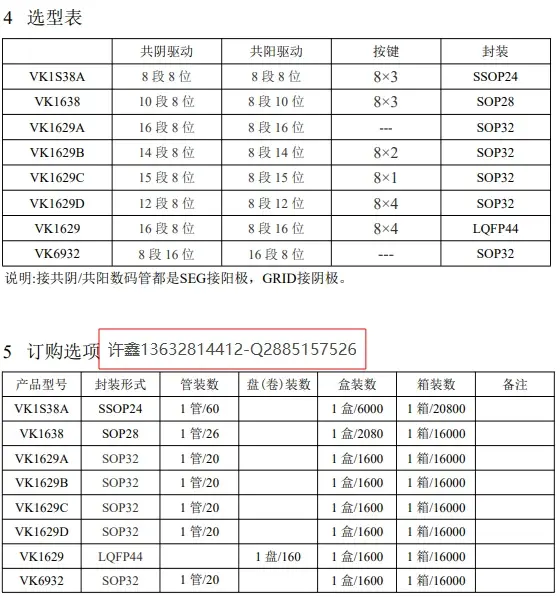 VK1629A 3.0~5.5V 驱动点阵:128 共阴驱动:16段8位 共阳驱动:8段16位 通讯接口:CLK/STB/DIO 静态电流/待机电流:<5mA/-- 按键:--- 封装:SOP32 抗干扰能力强