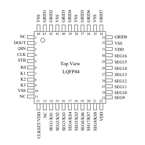 VK1629 3.0~5.5V 驱动点阵:128 共阴驱动:16段8位 共阳驱动:8段16位 通讯接口:CLK/STB/DIN/DOUT静态电流/待机电流:<5mA/-- 按键:8*4 封装:LQFP44(QFP44正方形); 抗干扰能力强