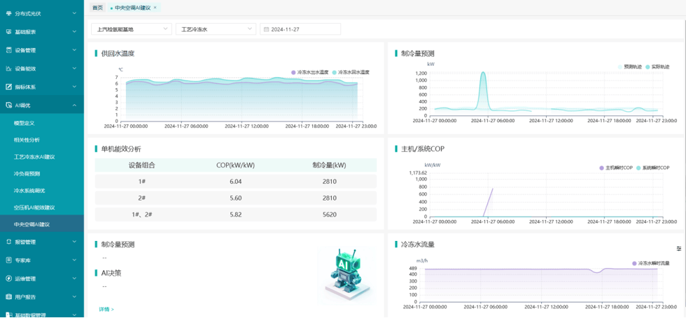 通过AI能效监控箱与楼层监控箱整体监控冷热源水系统与末端风系统运行状况;末端与冷热源联动优化整体能效水平;通过对天气、建筑以及集中式空调系统负荷进行预测,将有助于超前实现对系统运行的干预,指导用户合理开关机,并对冷机进行群控及优化,实现系统经济运行。