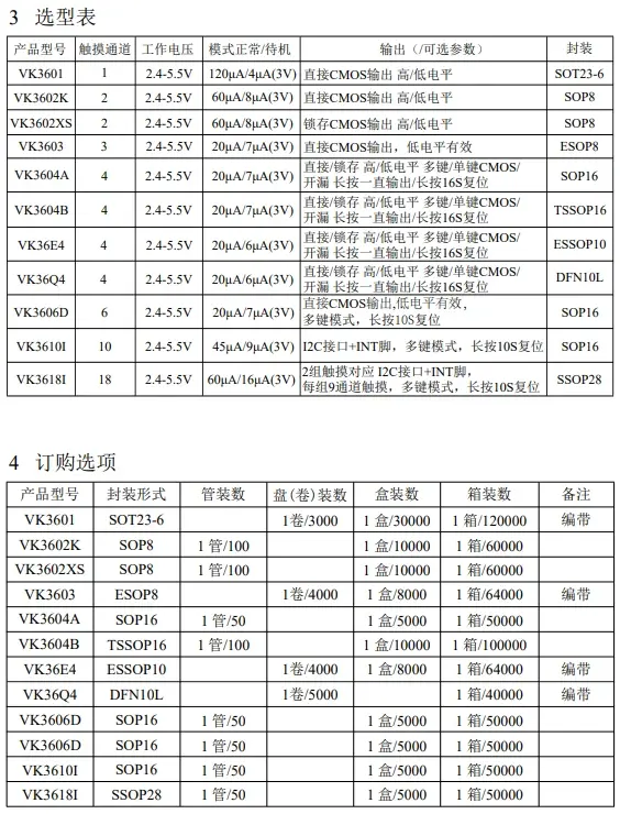 VK3602K/KA 工作电压/待机电流:2.4V-5.5V/8μA(3V) 感应通道数:2 输出方式:直接输出抗干扰/待机电流小,抗电源及手机干扰 封装:SOP8