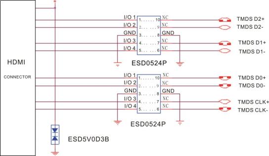 对于流线型高速信号线设计 和满足信号线阻抗要求 ,ESD0524P 的特殊设计 提供了ESD 的4线保护要求 ,符合IEC61000-4-2 ESD标准(±8KV CONTACT ESD 和 ±15KV Air ESD) , 同时提供卓越的嵌位电压特性 ,减少HDMI芯片的过压应力 ,提高HDMI 整体系统的可靠性 !