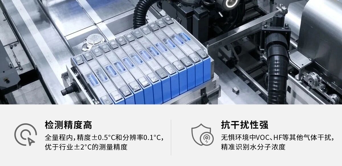 在锂电池车间中,露点传感器需同时满足精度高和强抗干扰的核心要求:不仅要在-70℃~-30℃的露点下保证测量准确,还要有效抵抗VOC、HF等干扰气体的影响。
