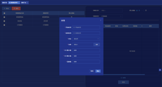 用于制定策略模版,根据“策略类型”进行模块切换,添加计划曲线、削峰填谷、新能源消纳、需量控制、动态扩容、逆功率等策略模版。再制定并管理储能策略模版中,选中某个策略后,右侧配置动画将展开;左侧可对储能模版进行增删改查,点击“添加”按钮时右侧展示空白策略模版生成悬浮窗,可输入自定义的策略模版名称,设定是否为默认模版(唯一值,设定为默认模版后,在策略下发页面每次进入将默认勾选);执行类型(计划曲线、削峰填谷、新能源消纳、需量控制、动态扩容、逆功率)等;以下对各策略进行展开说明。