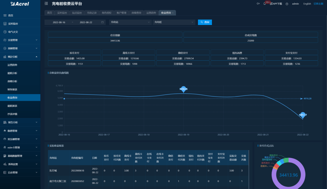 通过系统平台,从充电站点、充电设施、、充电时间、充电方式等不同角度,查询充电交易统计信息、能耗统计信息等。