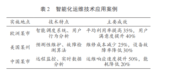 在电动汽车充电设施管理领域,国内外已有多个智能化运维技术的成功应用案例。这些案例展示了智能化技术如何显著提升充电设施的运营效率和用户体验。智能化运维技术应用案例如表2所示。由表2可知,一项针对欧洲某大城市充电网络的智能化升级项目显示,通过引入智能调度系统,充电站的平均利用率提高了35%、用户满意度提升了40%;在美国,某家主要的充电设施运营商通过部署预测性维护算法,减少了25%的维修成本,并将设备故障率降低了30%。这些案例证明了智能化运维技术在不同地区和不同规模的充电设施中的适用性和有效性,为全球电动汽车充电设施的智能化管理提供了宝贵的经验和数据支持。通过这些实践,可以看到智能化技术在提高充电设施管理效率、降低运营成本、增强用户体验方面的巨大潜力。