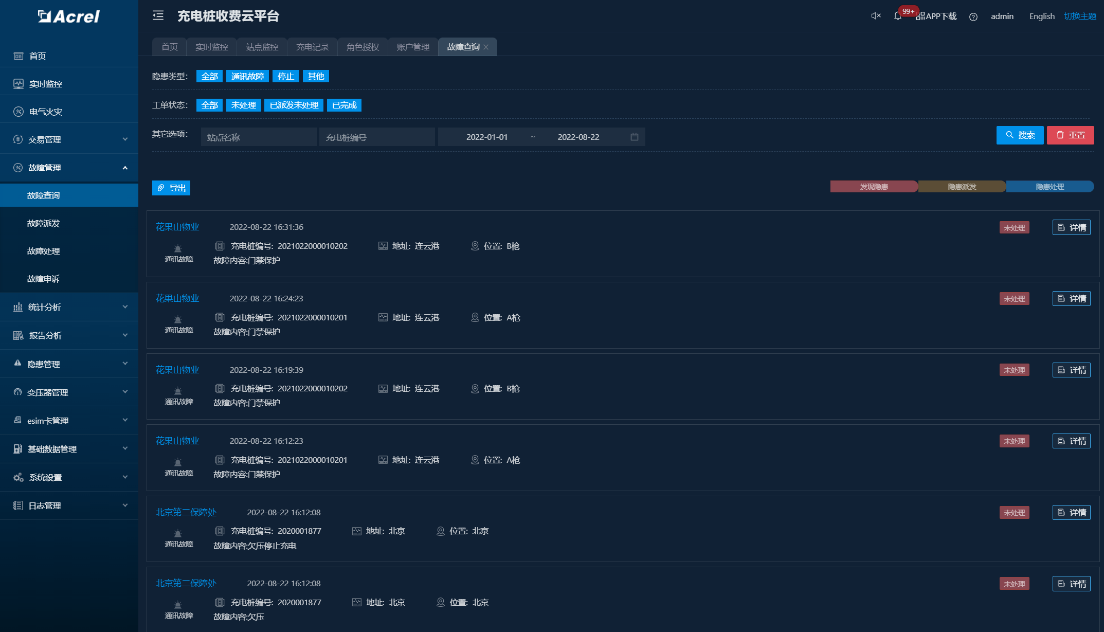 面向运维人员使用,可以对站点和充电桩进行管理、能够进行故障闭环处理、查询流量卡使用情况、查询充电充值情况,进行远程参数设置,同时可接收故障推送