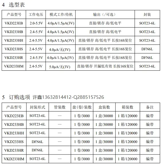 VKD233DQ/HQ 工作电压/工作电流/待机电流:2.4V-5.5V/4.0μA/---(3V) 感应通道数:1 输出方式:直接/锁存输出 最长响应时间快速模式46ms @VDD=3V 封装:SOT23-6 长按16S复位