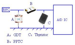 共模二极保护 (指视频同轴电缆离高压线或易受直击雷传导介质距离在 50 米内的设备保护)