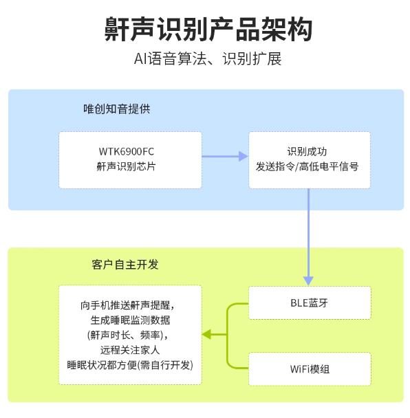 WTK6900FC有些特别,它是一款语音识别芯片,它不仅可以语音控制还拥有专门针对鼾声识别检测的算法。你可以把它想象成一位训练有素的"声音侦探",不过它侦查的目标不是人的说话声,而是那些影响睡眠质量的"不速之客"——鼾声。