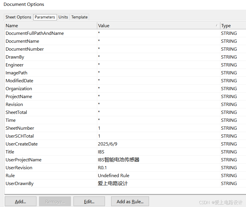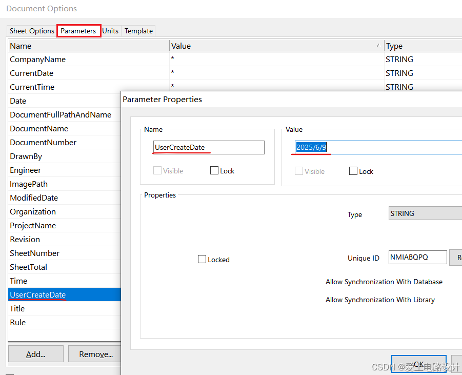 新建一个原理图文件,进入 Design → Document Options,并在第二项 Parameters 中添加 UserCreateDate,并在后面的文本中输入我们想要的内容,比如 2025/6/9: