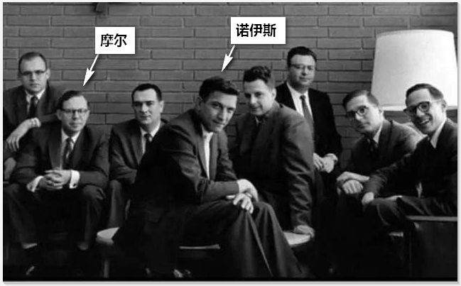实际上,在当时那个年代,罗伯特·诺伊斯的名气比摩尔更大一些。著名科学家、晶体管发明人威廉·肖克利,曾经痛骂八位硅谷奇才为“叛逆八人帮”。咱们的诺伊斯,就是八人帮的“带头大哥”。而摩尔,是剩下七位小弟其中之一。