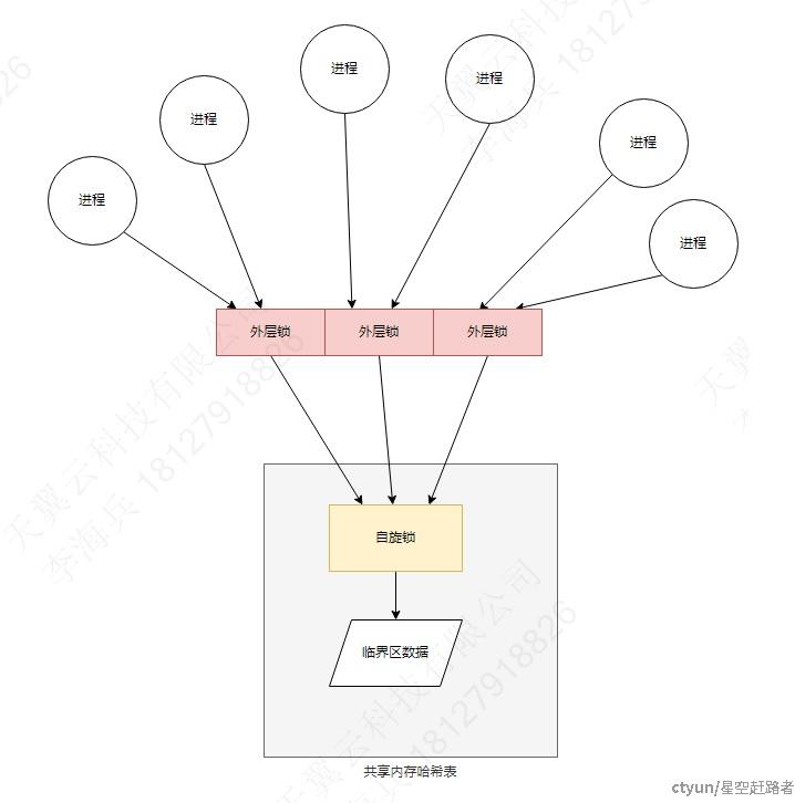 进程在读写共享内存哈希表之前,根据一定的哈希算法,哈希到某个外层锁加锁,只有加锁成功后,才有资格对内层锁加锁。
