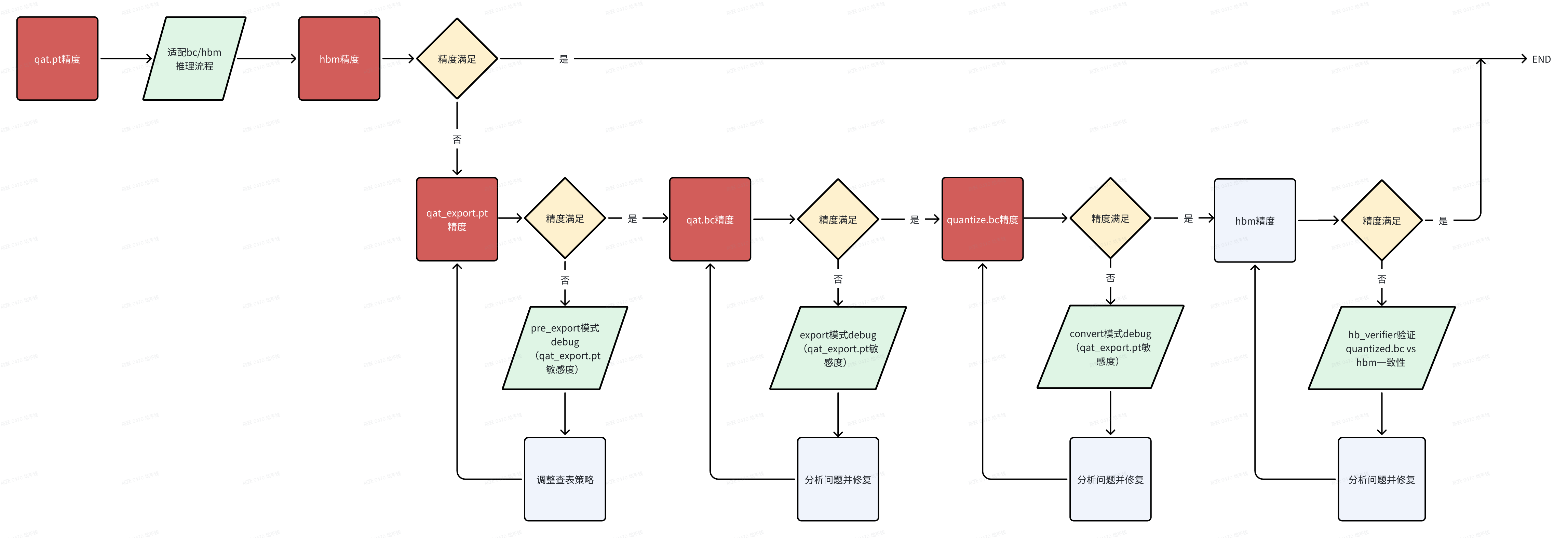 工具侧问题。例如:查表算子转定点(非线性函数使用多项式近似或分段线性近似来代替精确计算)、不同硬件对于浮点/定点实现不一致、rgb/yuv444 转 nv12 存在信息损失等,由于神经网络具有一定的鲁棒性,若不存在代码误用以及工具 bug 的情况下,板端 hbm 模型精度 与 torch qat 伪量化模型之间的误差很小。