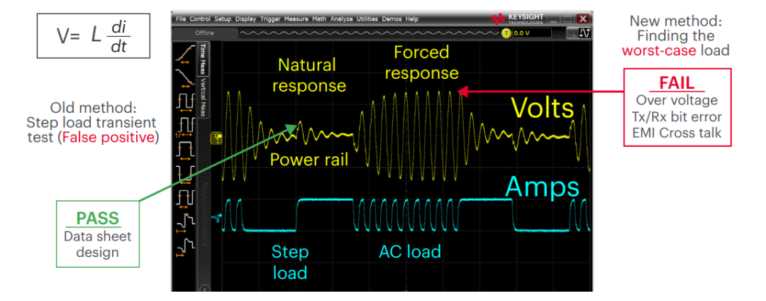 PDN必须为负载提供纯净的电源。电子设备有最高电压和纹波规格,以避免损坏、数据丢失和EMI/EMC故障。电源轨的目标是即使在电流负载以高频 di/dt 瞬态频繁开关时,也能提供恒定电压。测量电源轨噪声的传统方法通常无法检测到最坏情况的电压纹波。