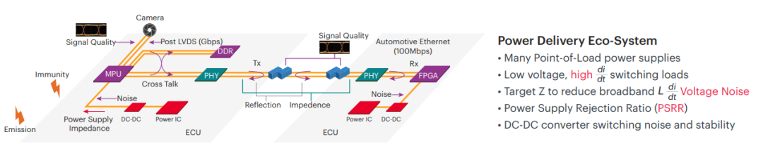 图2. 在这个代表当今复杂供电生态系统的自动驾驶汽车PDN示例中,电源完整性的核心在于微波频率下的快速供电。